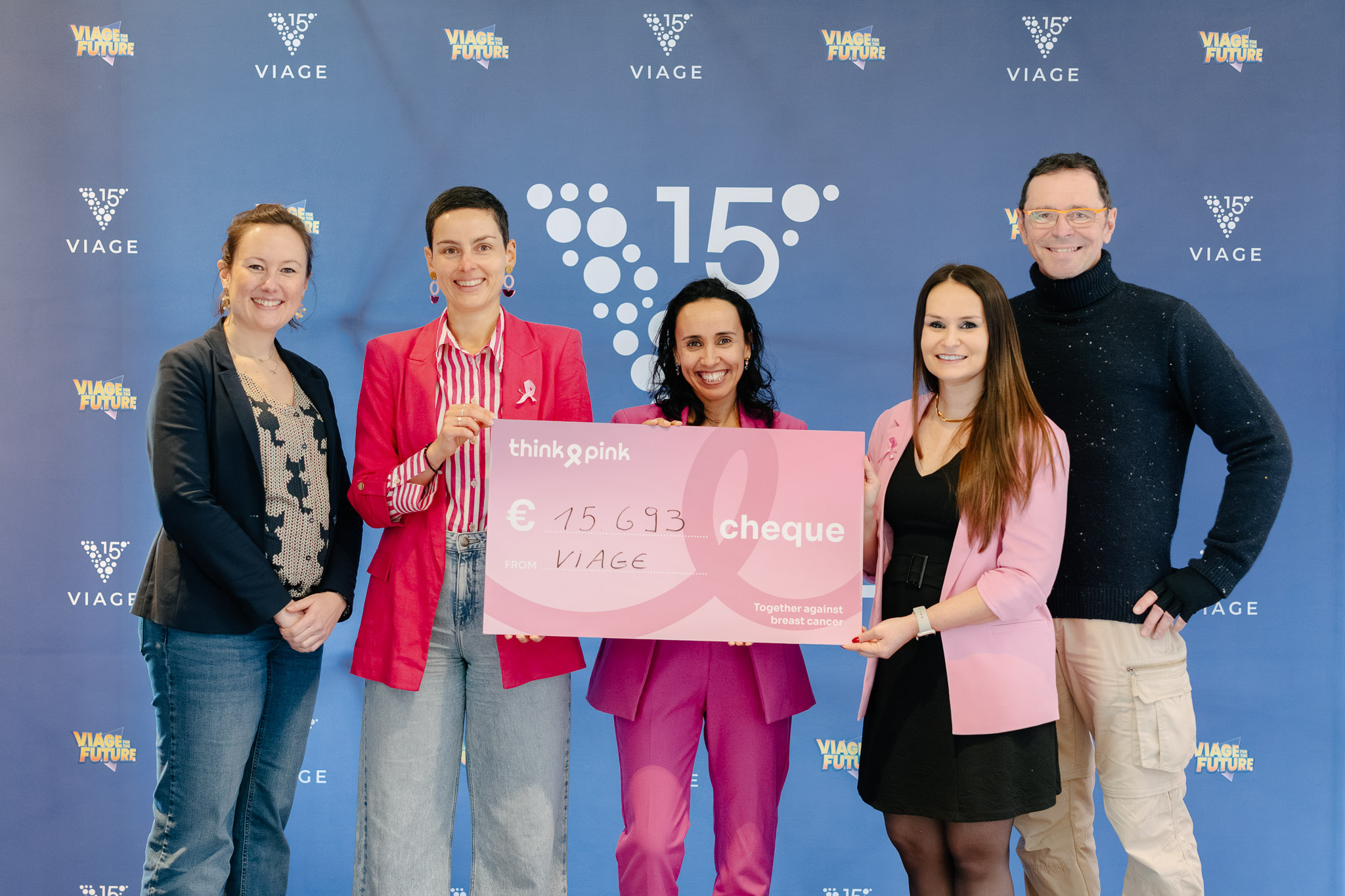 D’octobre à décembre 2025, VIAGE a rassemblé collaborateurs, clients et visiteurs autour d’une cause essentielle : la lutte contre le cancer du sein. Une mobilisation collective qui a abouti, le 18 février 2026, à la remise officielle d’un chèque de 15.693 euros à Tiffany Bulteau, porte-parole de Think Pink et en présence de Delphine Houba, Echevine du Logement, l'Egalité des Chances, du Tourisme et des grands événements de la Ville de Bruxelles,